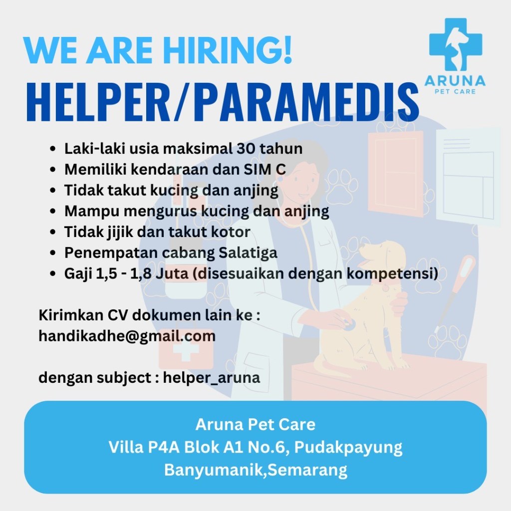 DokterHewan.Org – Aruna Pet Care yang beralamatkan di Villa P4A Blok A1 No. 6 Pundakpayung, Banyumanik kota Semarang membuka lowongan kerja untuk dokter hewan dan helper/ paramedis dengan persyaratan sebagai berikut :