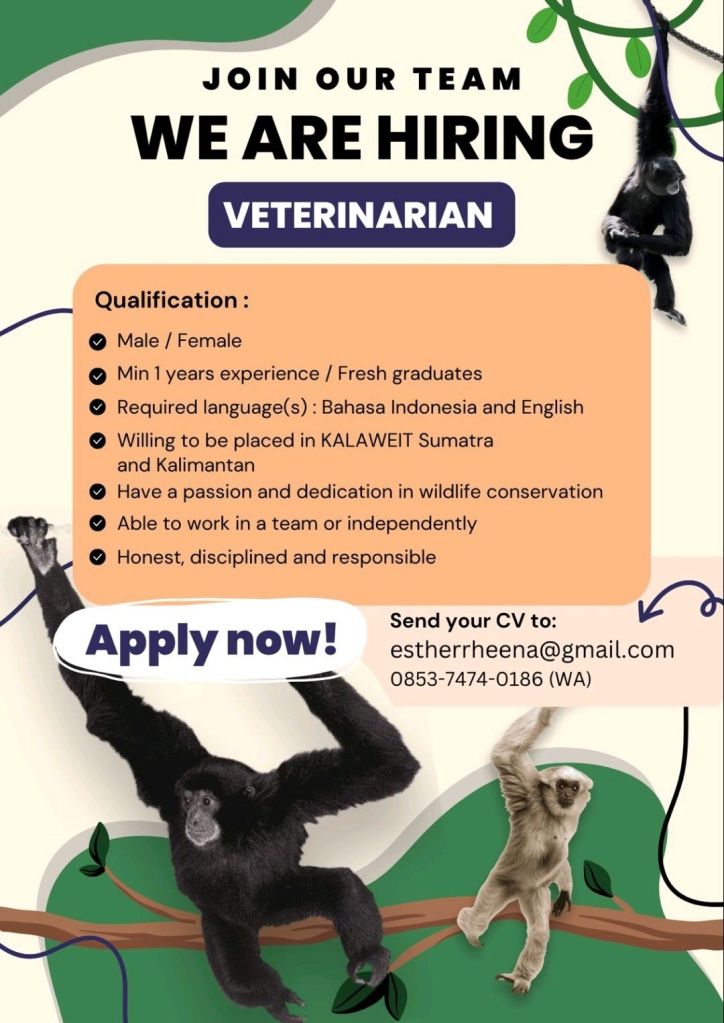 DokterHewan.Org – Yayasan Kalaweit Indonesia saat ini sedang mencari dokter hewan (veterinarian) yang memiliki ketertarikan dan berdedikasi pada konservasi satwa liar.