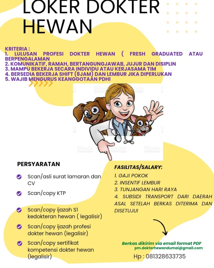 DokterHewan.Org – Praktek Mandiri Dokter Hewan di Kota Dumai membuka lowongan kerja untuk dua orang dokter hewan. Kriteria yang dibutuhkan antara lain: