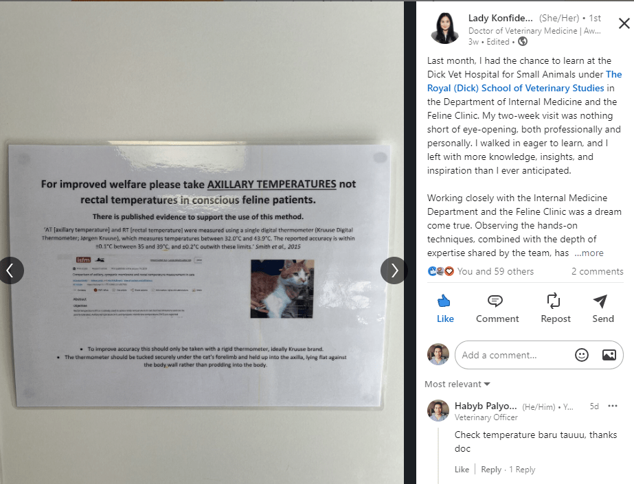 - Konfidenia Chintari, L. (2024, October 20). Post on feline temperature measurement and stress reduction at The University of Edinburgh’s Dick Vet Hospital. LinkedIn. https://www.linkedin.com/feed/update/urn:li:activity:7245449942582910976/